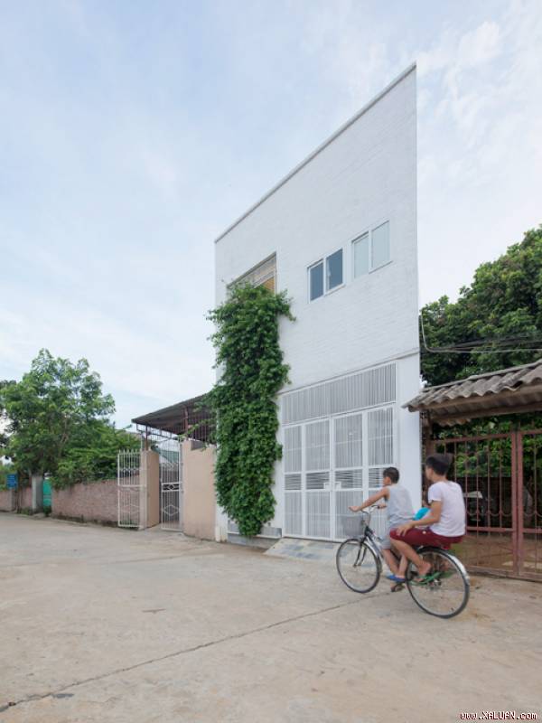 Ngôi nhà ở Thạch Thất (Hà Nội) xây dựng trên mảnh đất được tách ra từ phần hẹp nhất của một khu đất lớn. Để khắc phục điểm yếu này, người thiết kế dành khoảng diện tích không vuông vắn làm chỗ trồng cây, để xe.