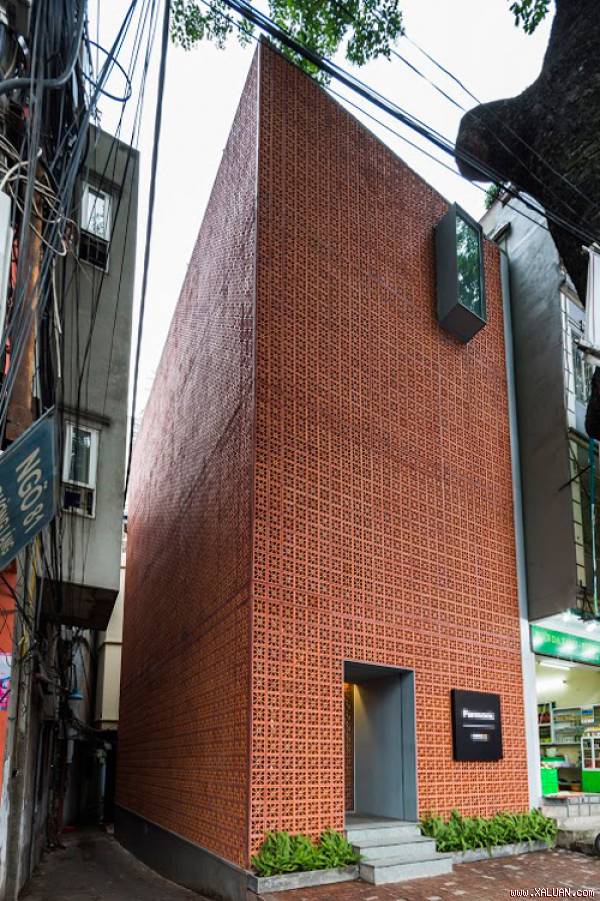 Nằm trên con đường đông đúc ở quận Đống Đa (Hà Nội), tòa nhà trưng bày sản phẩm của một công ty thu hút bởi kiến trúc khác lạ nhưng vẫn hài hòa với cảnh quan khu phố. Các bức tường bao quanh nhà được xây bằng những viên gạch thông gió dạng đất nung đỏ.