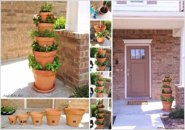 Những chậu trồng cây được chồng lên nhau theo thứ tự từ lớn đến bé cũng là cách thú vị để bạn tạo nên một khu vườn đứng xinh xắn ngay trước hiên nhà.