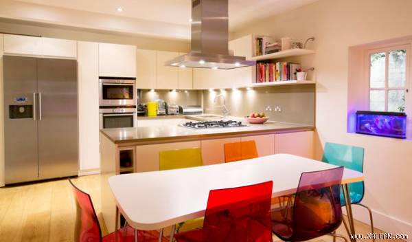 Những căn bếp truyền thống với gam màu trung tính sẽ trở nên tràn đầy năng lượng nếu bạn thêm vào đó một vài chi tiết màu sắc làm điểm nhấn. Đó có thể là những chiếc ghế, khăn trải bàn hay thậm chí là bộ xoong nồi đầy màu sắc.
